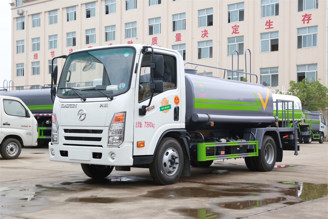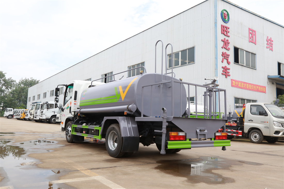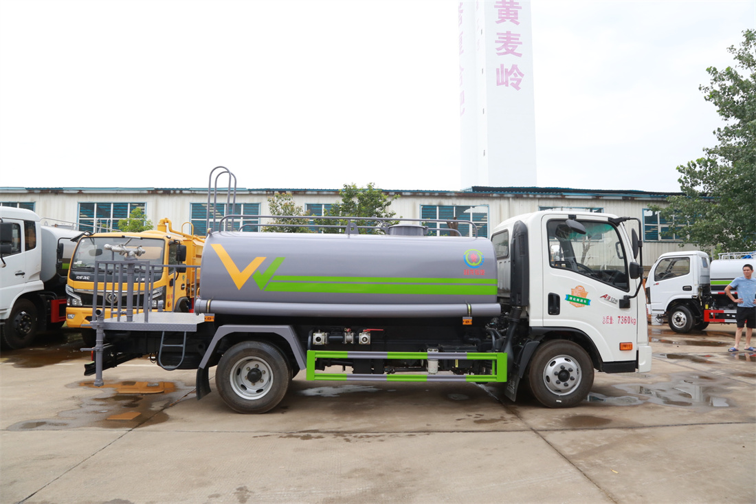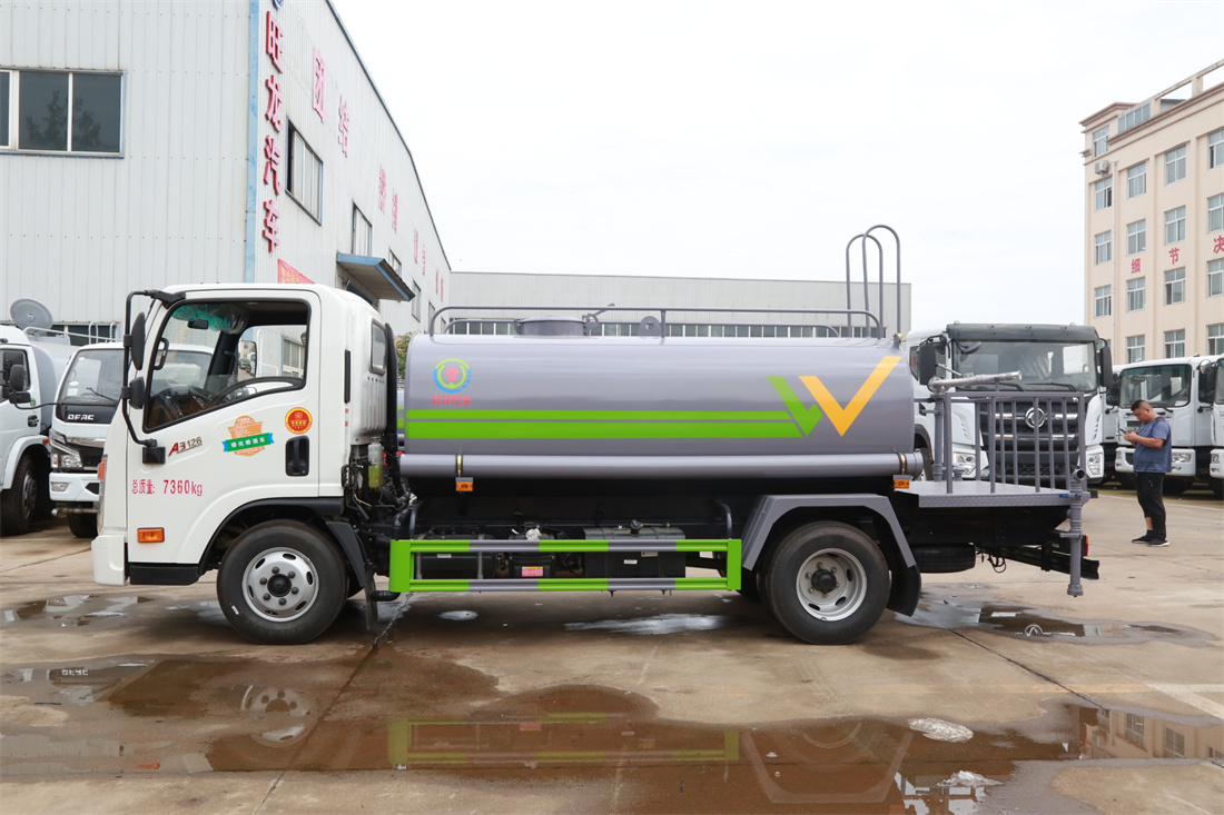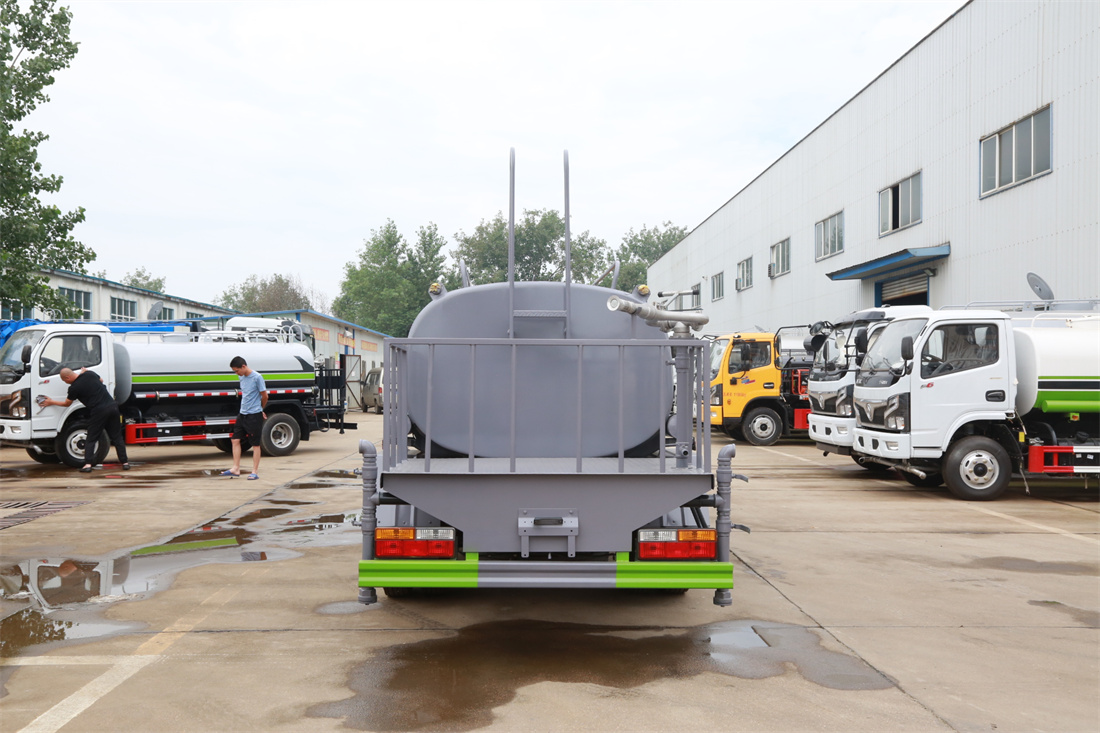 灑水車(chē)前裝有鴨形噴嘴或圓頭沖嘴,后面裝有圓柱開(kāi)灑水噴嘴或蓮蓬頭噴嘴,后部有一工作平臺(tái),裝配有水炮。后部還可裝8個(gè)噴嘴(選裝)。