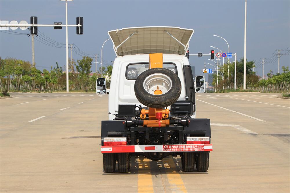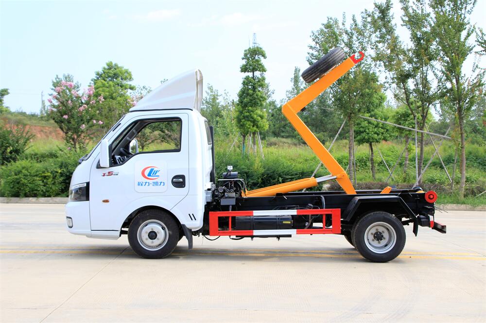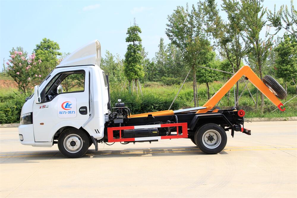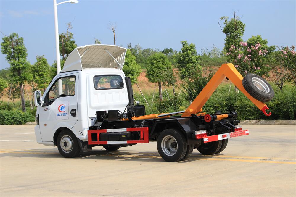 該款鉤臂式垃圾車由液壓系統(tǒng)、操作系統(tǒng)組成。舉升油制缸(1支)系國內知名液壓件廠家生產的雙作用油缸。垃圾廂可自吊上放下,可自行傾倒垃圾,上下一次工作循環(huán)時間≤50S。該車的特點是一個車能配多個垃圾廂,能實現(xiàn)一臺車與多個垃圾廂聯(lián)合作業(yè),循環(huán)運輸,充分提高了車輛的運輸能力。