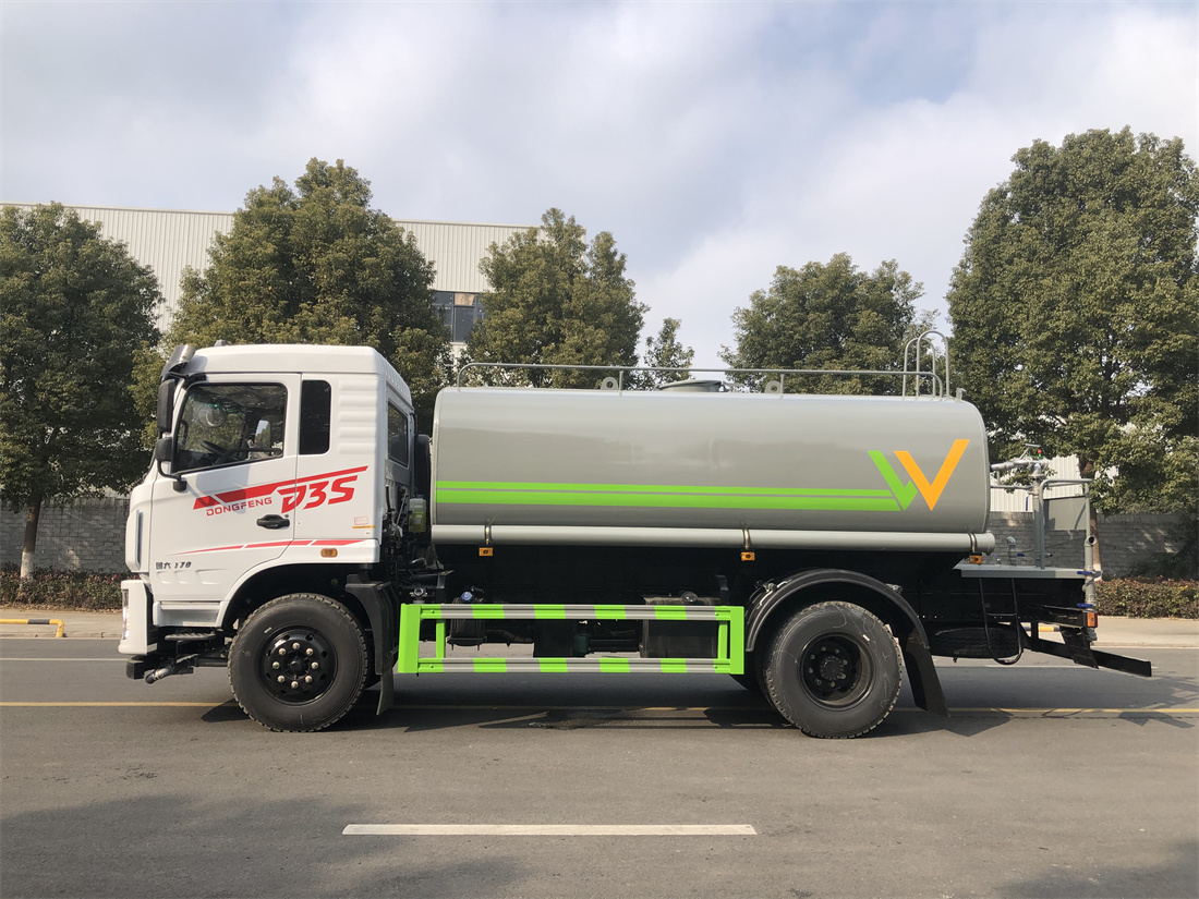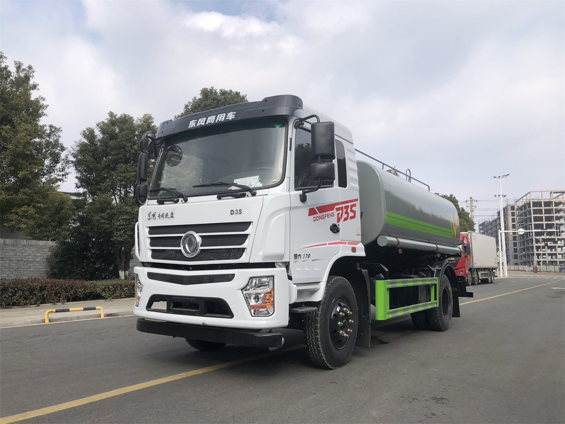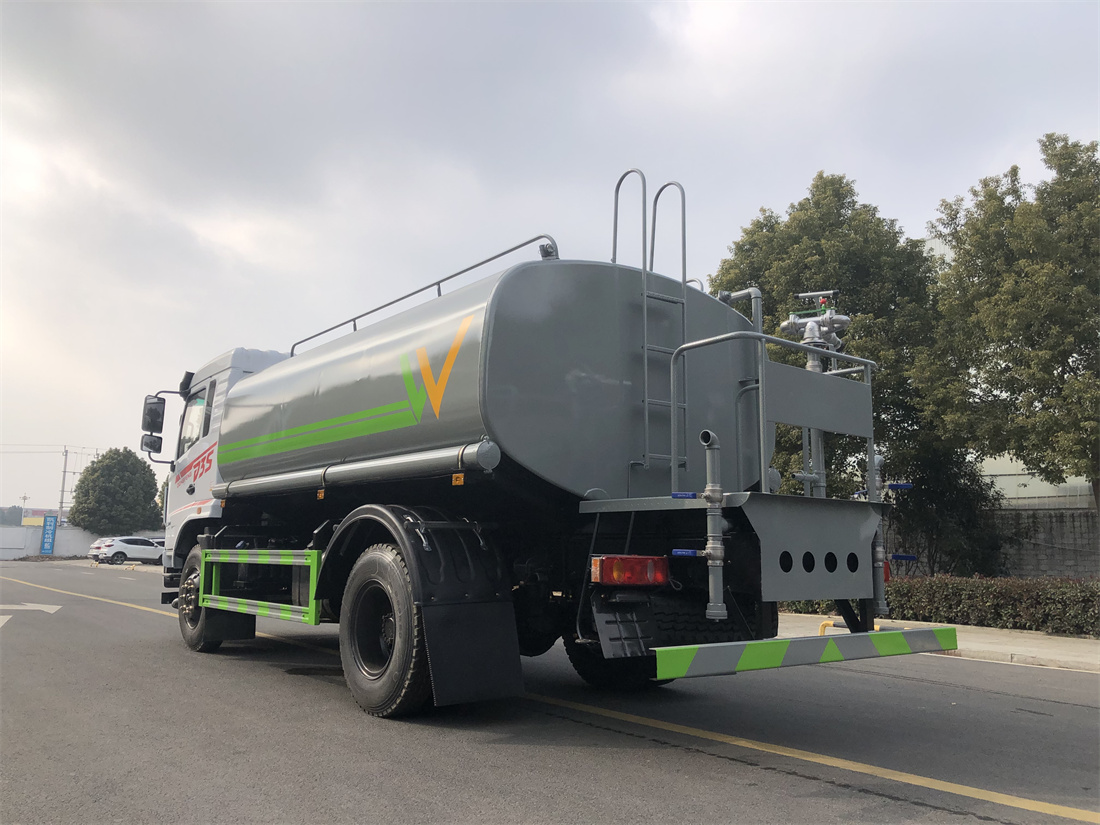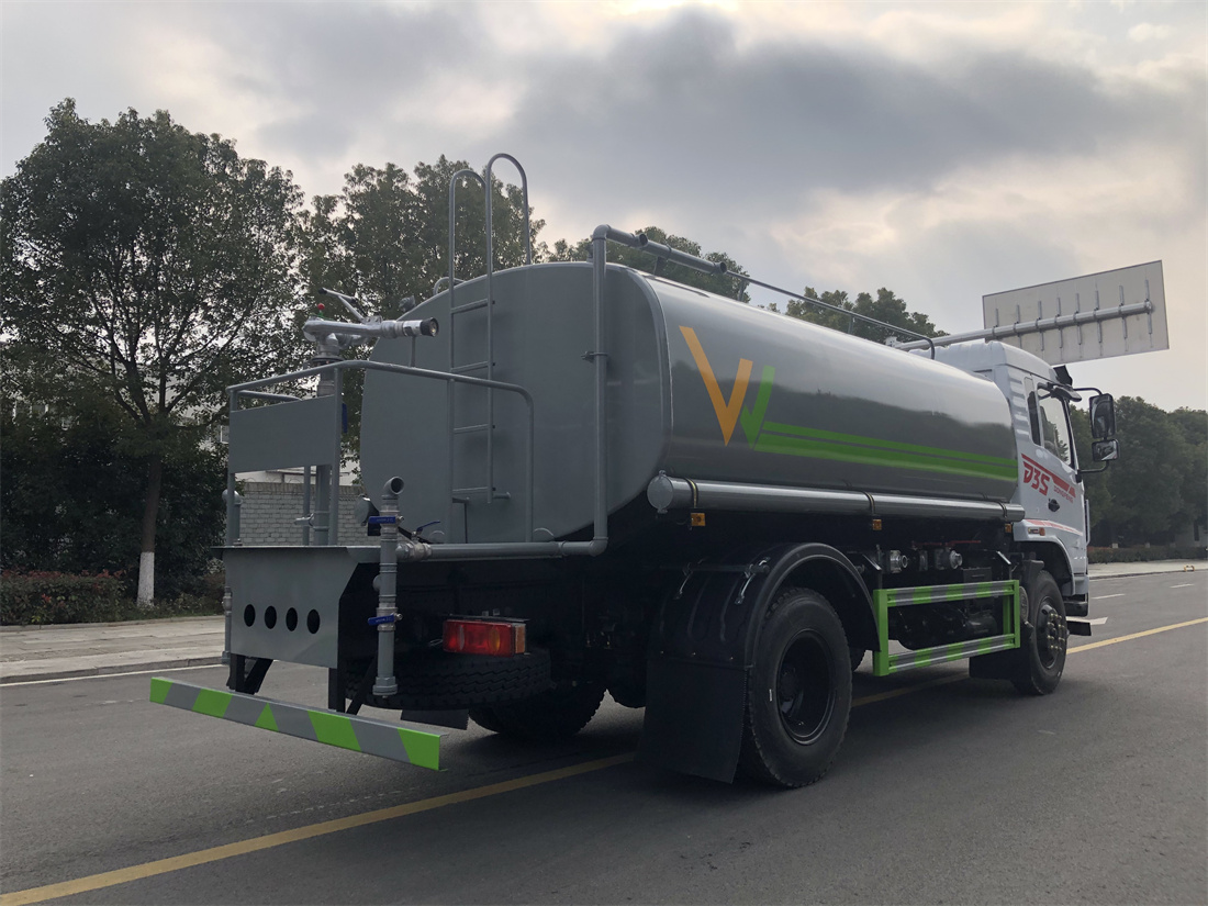 灑水車前裝有鴨形噴嘴或圓頭沖嘴,后面裝有圓柱開(kāi)灑水噴嘴或蓮蓬頭噴嘴,后部有一工作平臺(tái),裝配有水炮。后部還可裝8個(gè)噴嘴(選裝)。