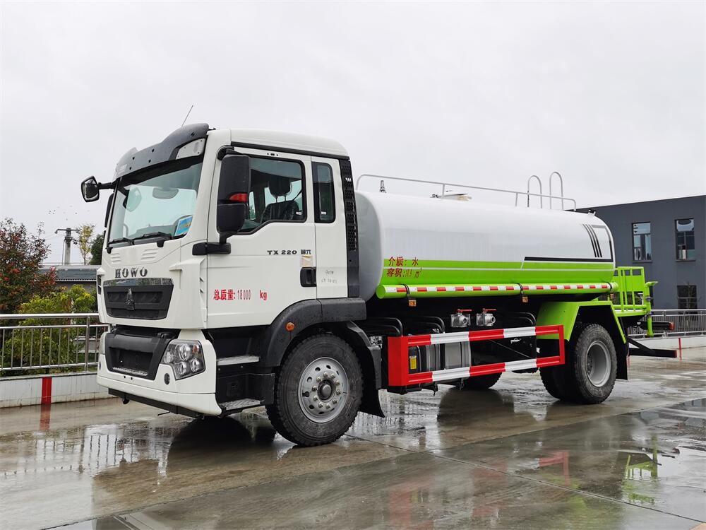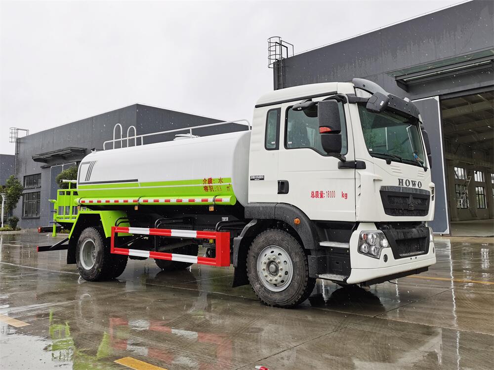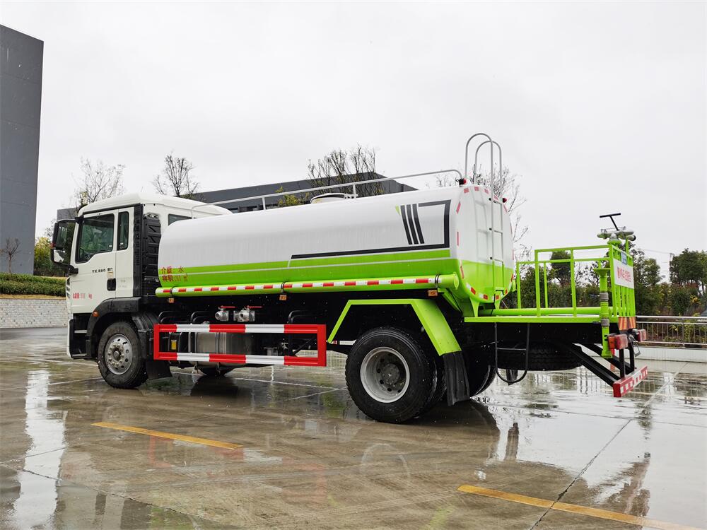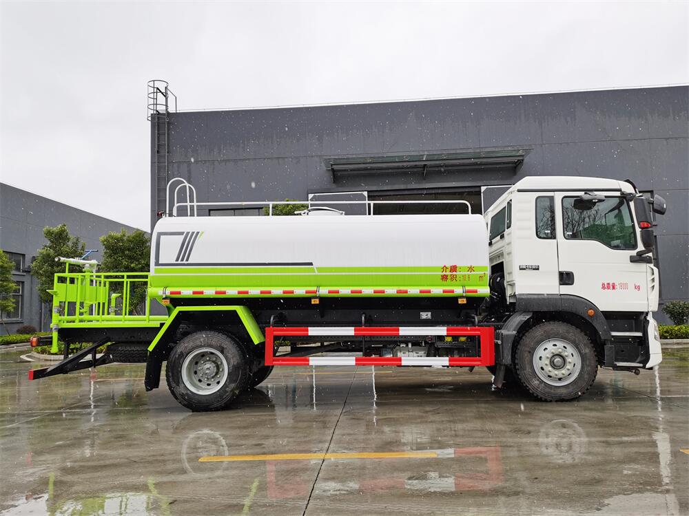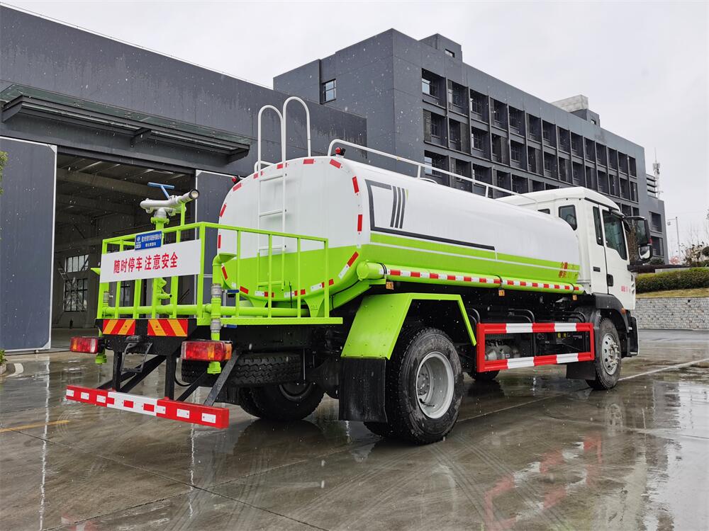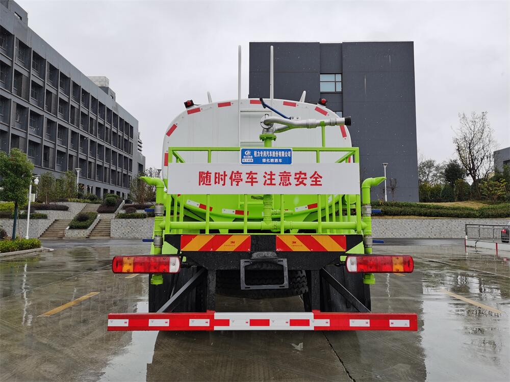 灑水車(chē)前裝有鴨形噴嘴或圓頭沖嘴,后面裝有圓柱開(kāi)灑水噴嘴或蓮蓬頭噴嘴,后部有一工作平臺(tái),裝配有水炮。后部還可裝8個(gè)噴嘴(選裝)。