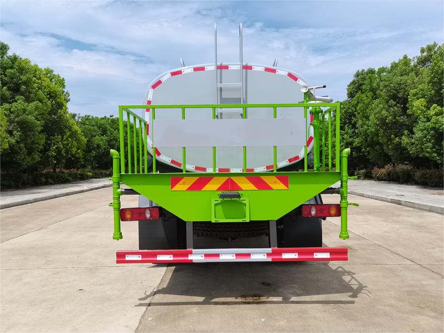 灑水車前裝有鴨形噴嘴或圓頭沖嘴,后面裝有圓柱開灑水噴嘴或蓮蓬頭噴嘴,后部有一工作平臺(tái),裝配有水炮。后部還可裝8個(gè)噴嘴(選裝)。