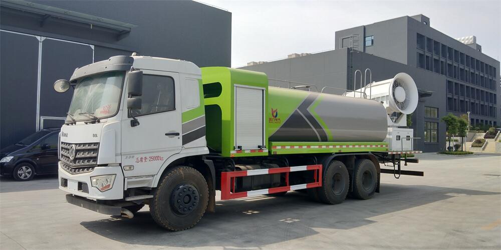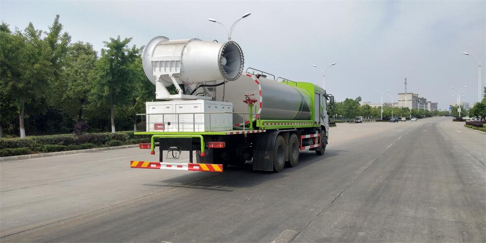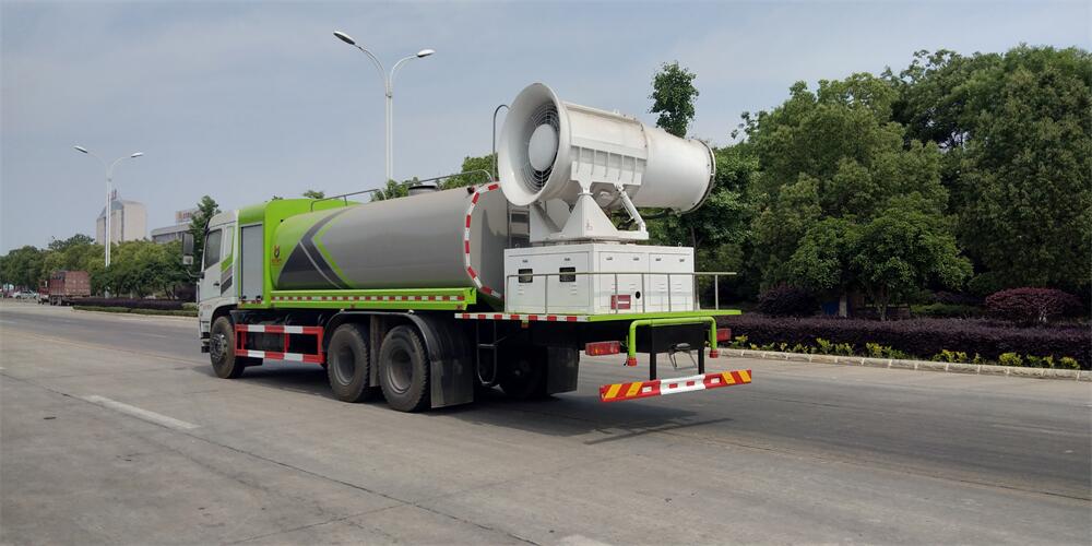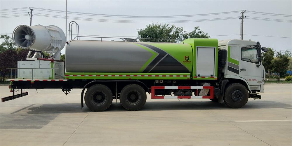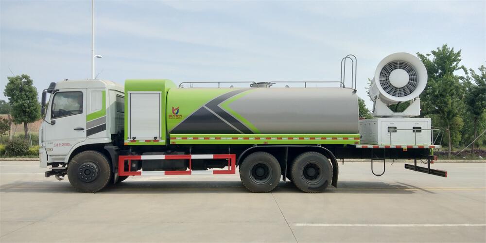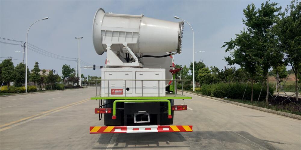 上裝配置:罐體容積為 16立方,選配風送式霧炮機組射程30米、40米、50米、60米、80米、100米、120米霧炮,罐體鋼板為4mm碳鋼Q235材質,罐內隔板具有防波作用,以減輕汽車行駛時罐體液體沖擊,罐體及整車外形尺寸按照公告。帶大功率專用灑水泵,泵可自吸自排,整車前沖、后灑、側噴、帶65消防接口,后平臺配CLW-50、CLW-60、CLW-80、CLW-100、CLW-120型風送式霧炮機組;罐體前封頭配大功率柴油發電機組;前封頭帶水位計,后平臺主管路帶1寸澆花接口,后爬梯。帶兩根輸水管及陰陽端。罐體顏色:銀/灰/綠,罐體兩側噴“多功能抑塵車”字樣,貼反光標示。