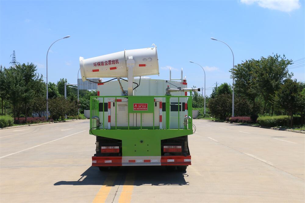上裝配置:罐體容積為 16立方,選配風送式霧炮機組射程30米、40米、50米、60米、80米、100米、120米霧炮,罐體鋼板為4mm碳鋼Q235材質(zhì),罐內(nèi)隔板具有防波作用,以減輕汽車行駛時罐體液體沖擊,罐體及整車外形尺寸按照公告。帶大功率專用灑水泵,泵可自吸自排,整車前沖、后灑、側噴、帶65消防接口,后平臺配CLW-50、CLW-60、CLW-80、CLW-100、CLW-120型風送式霧炮機組;罐體前封頭配大功率柴油發(fā)電機組;前封頭帶水位計,后平臺主管路帶1寸澆花接口,后爬梯。帶兩根輸水管及陰陽端。罐體顏色:銀/灰/綠,罐體兩側噴“多功能抑塵車”字樣,貼反光標示。