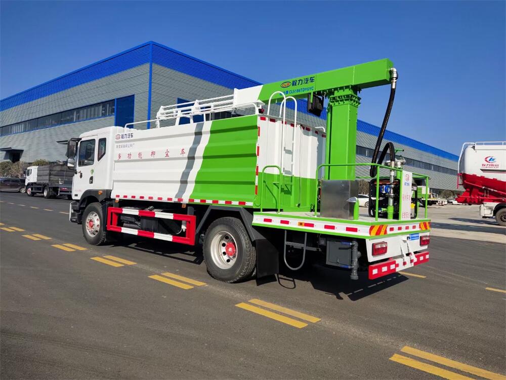 東風(fēng)D9多功能鐵路抑塵車,整車型號(hào):CL5186TDY6YC,底盤型號(hào):EQ1185LJ9CDE,總質(zhì)量:18000KG,整備質(zhì)量(車輛自重):9660 KG,額定載質(zhì)量:(上戶噸位):8145KG,4500軸距,大容積罐體滿載15立方(罐內(nèi)采用環(huán)氧玻璃鱗片防腐處理質(zhì)保兩年)、新穎的罐體設(shè)計(jì)使車輛行駛更穩(wěn)定、使用壽命更長(zhǎng),大容量方型水箱,前沖、后灑、側(cè)噴、高炮,抑塵噴灑桿(帶旋轉(zhuǎn)升降功能,液壓升降、液壓旋轉(zhuǎn))。噴灑桿離地3.5-5.6米 、180°旋轉(zhuǎn),后部平臺(tái)帶8KW柴油發(fā)電機(jī)組、電控箱。整車采用全智能駕駛室觸摸屏及遙控操作:車輛噴淋系統(tǒng)、攪拌、旋轉(zhuǎn)臂、加熱等等功能。灑水功能采用主機(jī)動(dòng)力。旋轉(zhuǎn)、升降、攪拌采用發(fā)電機(jī)組動(dòng)力,配電箱預(yù)留外接電源接頭套。噴淋系統(tǒng)加裝單車流量計(jì)(用于計(jì)量抑塵劑噴灑量。)