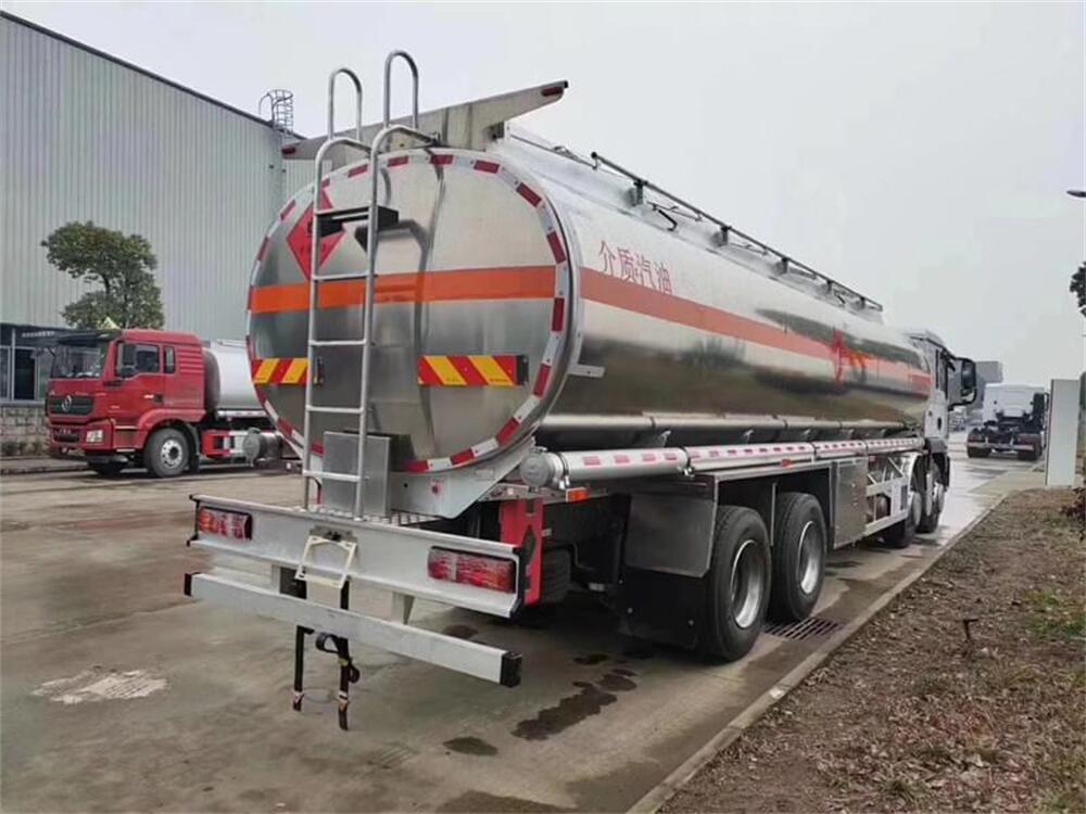 2.上裝配置:上裝采用國標5083鋁合金板材,公告容積30.4(實際有效容積約32立方),標配單倉,帶泵進泵出,標配兩個歐標罐蓋和緊急切斷閥,帶歐標全套下裝油系統(含下裝卸油閥、防溢流裝置和油氣回收裝置等),罐體頂部兩側帶折疊式升降防護欄,隨車配送兩根卸料軟管、陰陽端接頭、下裝油口轉換接頭等,其余均為廠家標配。罐體油漆為銀粉色金屬漆,兩側及后封頭水平正中貼3M-1級橙色反光帶,反光板,貼“易燃液體”標識,貼安全告示牌。