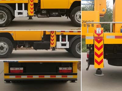 后伸:300mm;隨底盤選裝駕駛室;選裝吊鉤;側面防護及后下部防護裝置材料材質:Q235,連接方式:焊接加螺栓連接;后下部防護裝置斷面尺寸(寬贅?:30?00(mm),離地高度:350mm;ABS廠家及型號:襄陽東風隆誠機械有限責任公司/ABS/ASR-24V-4S/4M;主要專用裝置為折疊臂,用于搶修電力、通訊、路燈等高空作業.