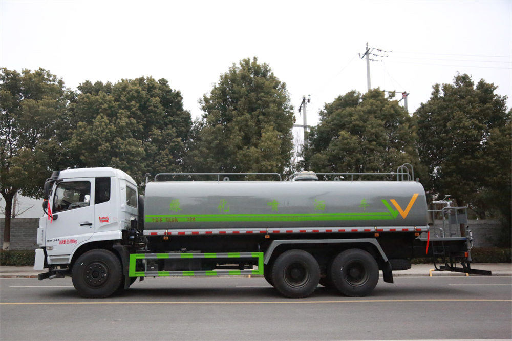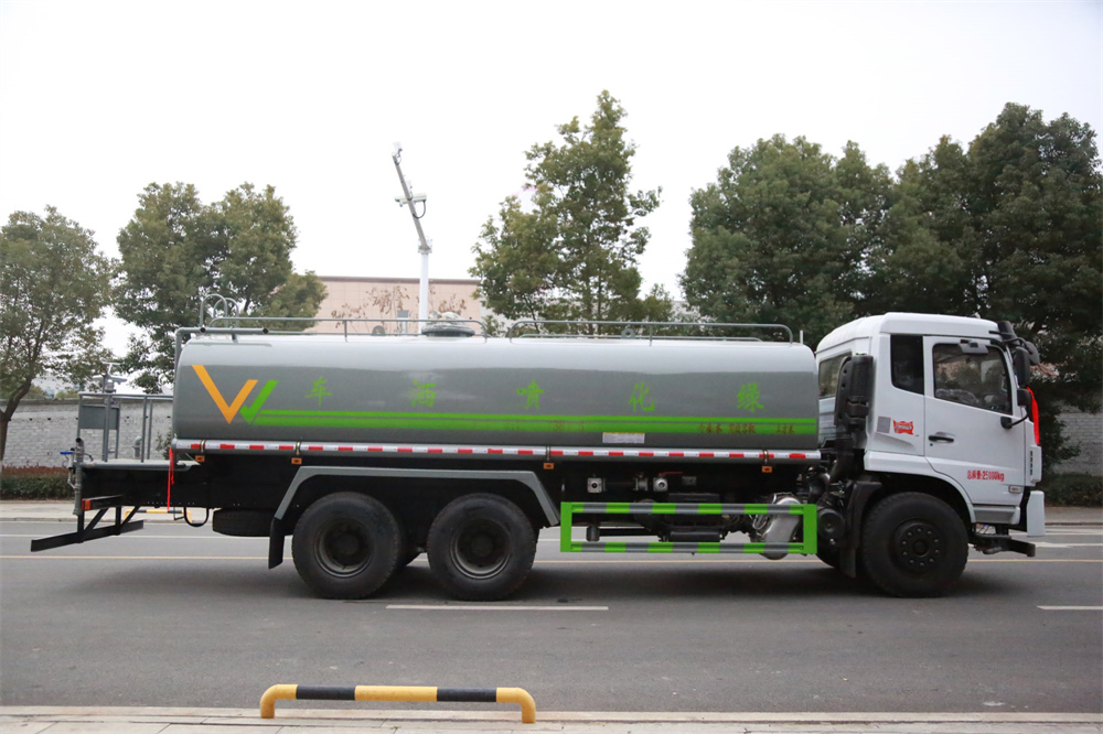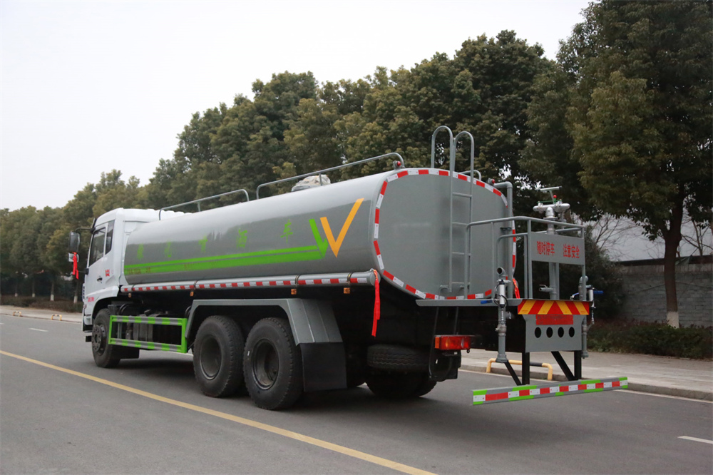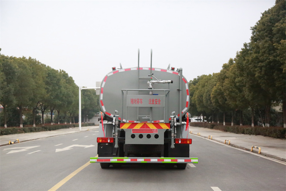 灑水車前裝有鴨形噴嘴或圓頭沖嘴,后面裝有圓柱開(kāi)灑水噴嘴或蓮蓬頭噴嘴,后部有一工作平臺(tái),裝配有水炮。后部還可裝8個(gè)噴嘴(選裝)。