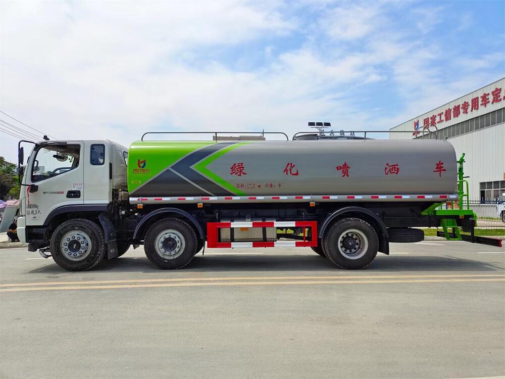 灑水車性能特點:前沖(噴)后灑,帶側噴,罐體后帶工作平臺,平臺上安裝綠化灑水炮,灑水炮可360旋轉,可連續調成直沖狀、大雨、小雨、毛毛雨,帶安全護欄,配備全國質量評比**名的杭州威龍大功率專用  灑水泵,泵可自吸自排,安裝過濾網,帶消防接口,可通過消防栓進水,帶自流閥,隨車選裝20米綠化卷盤,可噴灑農藥。